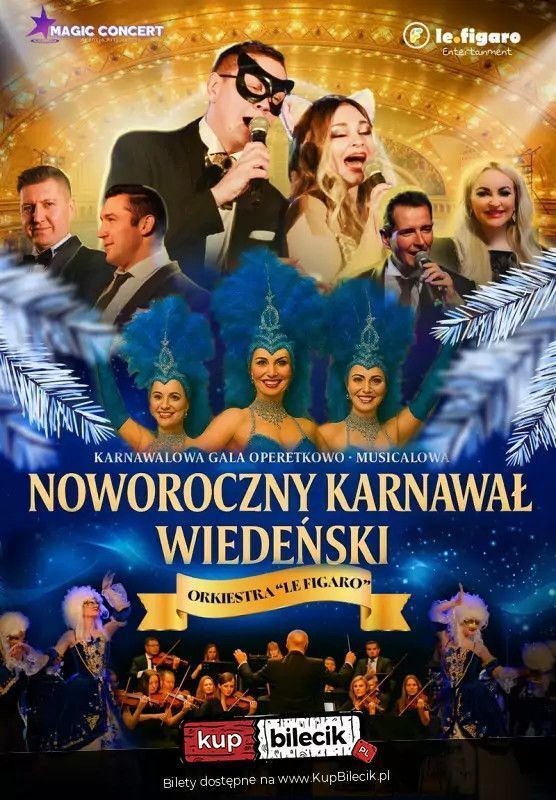 Rozpocznij Nowy Rok w wyjątkowym stylu! Zapraszamy na magiczny wieczór pełen elegancji, muzyki i niezapomnianych emocji. Noworoczny Karnawał Wiedeński to jedno z najbardziej oczekiwanych wydarzeń sezonu - koncert, który łączy piękno tradycji z żywiołową radością wspólnego świętowania. To wyjątkowe widowisko muzyczne przeniesie Państwa w świat dawnych wiedeńskich sal balowych - pełen światła, przepychu i kulturalnego splendoru. Na scenie pojawią się znakomici soliści, zespół wokalny Magic Tenors, urzekające sopranistki, barwny balet oraz Orkiestra Le Figaro pod batutą doświadczonego dyrygenta. Wszystko to w zachwycającej oprawie: wytworne kostiumy, elegancka choreografia i doskonała scenografia tworzą atmosferę prawdziwego karnawału, w której każdy widz czuje się wyjątkowo.